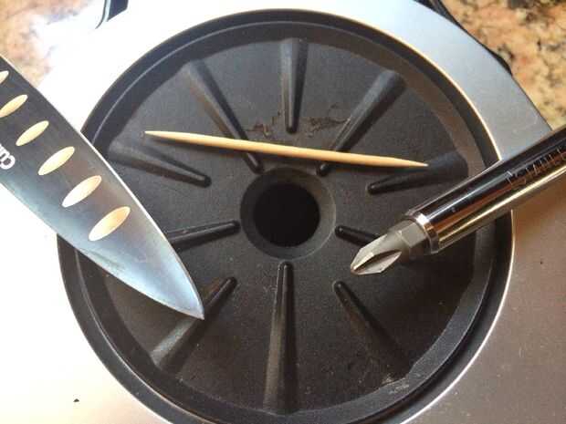 Decidido a arreglar este mismo, comenzó a tomar distancia y encuentra rápidamente el tema. Pensé en que compartir aquí para que otros pudieran beneficiarse de este conocimiento. Las únicas herramientas necesitadas son un palillo de dientes, una punta afilada como un cuchillo pequeño de cocina, una tachuela plástica (o un pico de metal si tiene una) y un destornillador. Te recomiendo quitar el depósito de agua, desenchufar la máquina y colocarla sobre una toalla en un lugar con buena iluminación. La toalla es para evitar que los pequeños tornillos y arandelas desapareciendo!