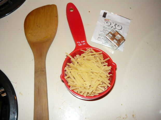 Caldo se vende en paquetes, los cubos y a granel. La mayoría de las instrucciones de caldo solicite un paquete por cada dos tazas de agua. Aunque estamos utilizando seis tazas de agua, sólo uso dos paquetes de caldo. El agua es absorbido por las verduras y los fideos, y algunos se hierve apagado. He encontrado que el uso de tres paquetes de caldo hace el caldo demasiado salado. Si utilizas productos Sr. Noodle, utilizar lo que viene con el paquete y añadir otro cubo.