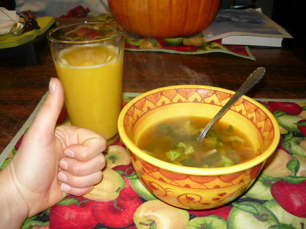Disfrutar de su sopa de fideos de pollo caseras a lo largo de lado un vaso de jugo de naranja. Las vitaminas del jugo y las verduras en la sopa lo ayudará a sentirse mejor. Dejar los platos para mañana y voy a la cama temprano.