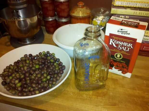 Los tarros. Un frasco de vidrio que puede sellar a trabajar. He utilizado frascos de boca ancha en el pasado pero finalmente encontró que prefiero botellas de leche. El cuello más estrecho facilita mantener cualquier flotantes aceitunas en la salmuera y tenemos un suministro constante de ellos como compramos leche en botellas de vidrio. Puede usar frascos para conservas, albarelos o jarras grandes con balas sobre ellos. Lo que funcione para usted. En mi caso encuentro que una bolsa de dos libras de aceitunas se ajusta bien en una botella de 64oz 1,87 por litro.