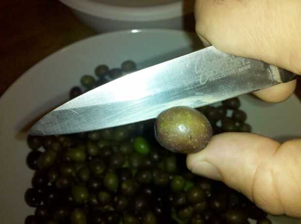 Cuando ser muy cuidado de no cortar los hoyos cuenta con un cuchillo. Aceitunas frescas son amargos y cortar el hoyo puede liberar más de la sustancia química que les hace tan.