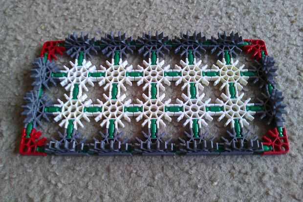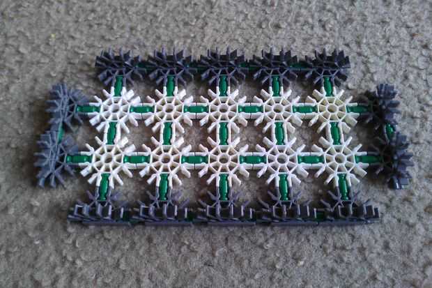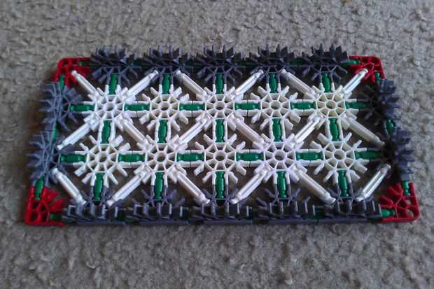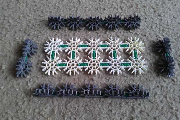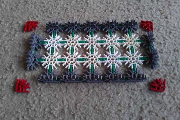 Tomar todas las piezas que hiciste en el paso anterior y como se muestra usando barras verdes. A continuación, tomar cuatro conectores rojo y adjuntarlos a las esquinas de la base, usando una vez más barras verdes. Finalmente, rellene todos los espacios con barras blancas.