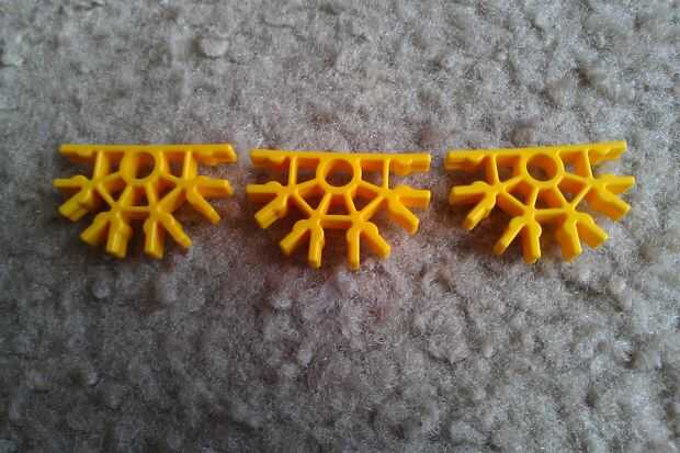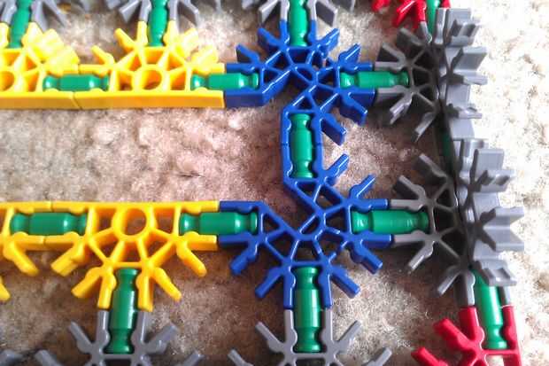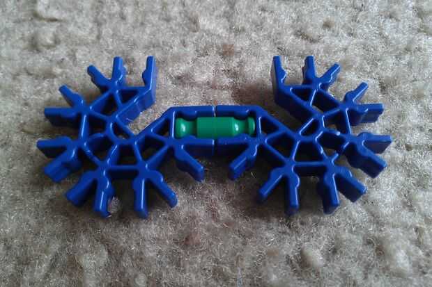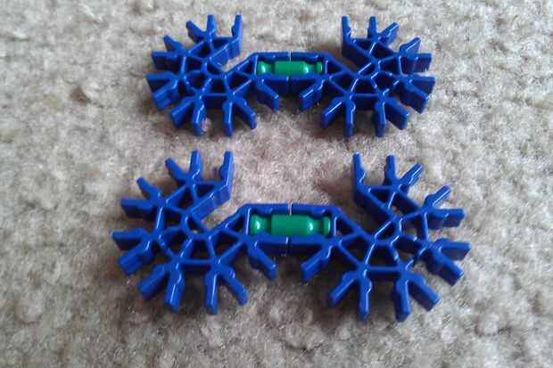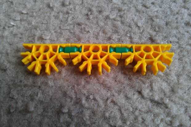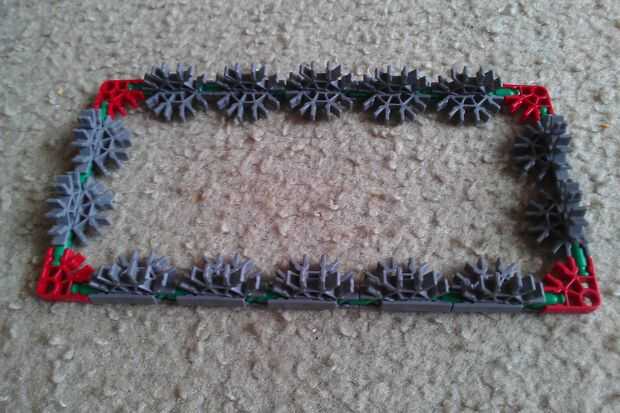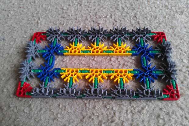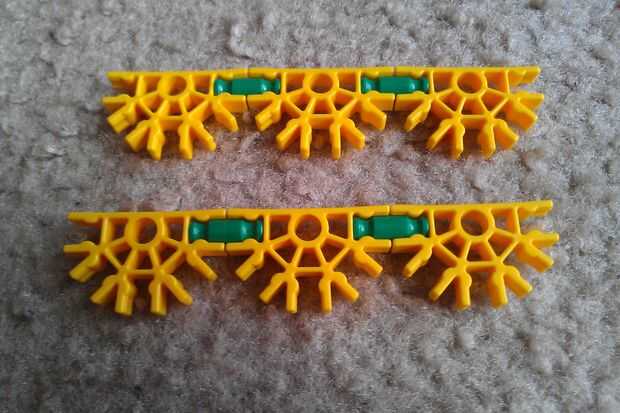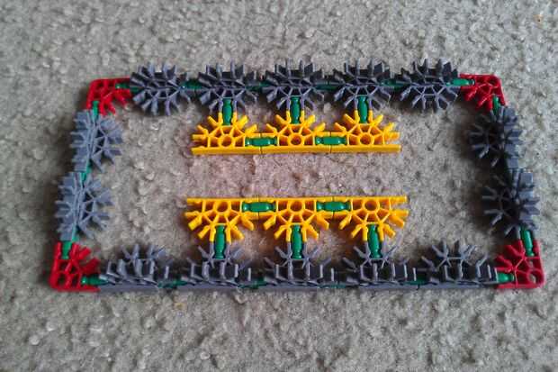 Para hacer la parte superior de la caja del tejido, simplemente rehacer el marco externo de la parte inferior de la mitad de la caja. A continuación, tomar tres conectores amarillos y conectarlos mediante barras verdes. Repita el procedimiento para obtener dos filas separadas y agregarlos a la estructura. A continuación, tomar dos conectores azules y conectarlos exactamente como se indica con una barra verde. Repita el procedimiento para obtener dos piezas separadas y agregarlos a la estructura exactamente como se muestra.