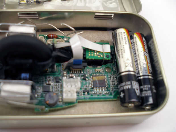 era realmente muy aburrido en el trabajo así que hice esto. Usé un ratón con una cuerda rota y una lata altoids. Esto es bastante desprolijo. Yo no tenía mucho para mi suministros y no realmente mi corte de tiempo. Sin embargo en general esto funcion