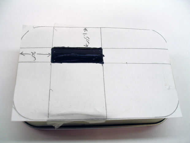 Trazó el estaño para obtener una base en donde estoy poniendo el tablero. La óptica medida 1cmc3cm con 2 muescas poco. Offset 1,5 cm más y 2 cm arriba de la esquina inferior izquierda de la lata (fácil de ver en la imagen). Luego cortar mi rastro y el agujero para cortarse y colocarse temporalmente en la parte inferior por lo que podría marcar la parte inferior con un rotulador para cortar.