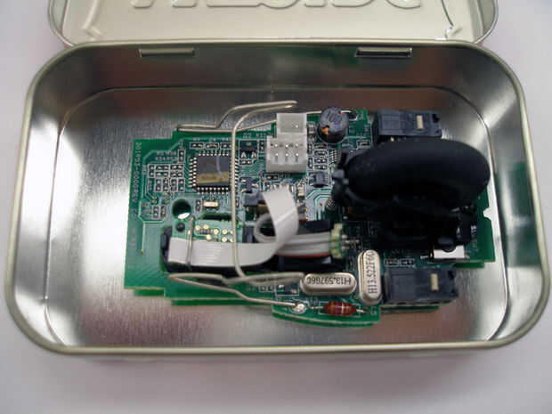 era realmente muy aburrido en el trabajo así que hice esto. Usé un ratón con una cuerda rota y una lata altoids. Esto es bastante desprolijo. Yo no tenía mucho para mi suministros y no realmente mi corte de tiempo. Sin embargo en general esto funcion