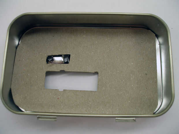 Con doblar hacia atrás el metal fue algo desigual dentro. Usé algunos de la cinta de espuma a nivel de la pieza de cartón por lo que la Junta se pone plana dentro. Los dos orificios se pusieron en el poder y botones de reajuste. Puede ser empujados con un bolígrafo o un clip.