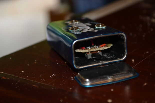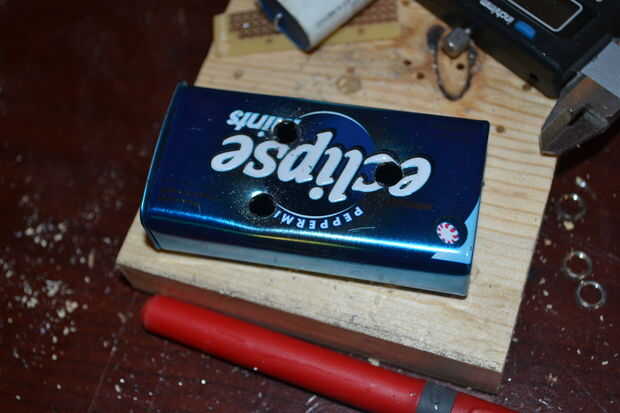 El recinto tiene 3 agujeros y 1 ranura (o ninguna ranura si quieres adentro como lo he hecho). Utilice el circuito terminado para marcar las ubicaciones de los enchufes en una hoja de papel. Luego marca y centro de perforan los puntos sobre el caso. Esto es donde echan a mi lata Altoids. Coloqué boca abajo el circuito terminado en la parte superior de la lata, así que cuando me lo entregaron después de taladrar los agujeros y trató de poner las tomas a través de dentro de la alineación estaba apagado. No ser un idiota como yo, creo que más de un paso por delante.