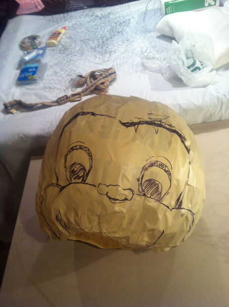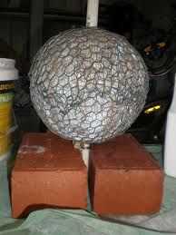Al moldear el pedazo de alambre de pollo en un balón redondo. dejar una abertura en la parte inferior de la cabeza para adaptarse a. la apertura puede ser más grande de lo normal porque aún necesita añadir boca de Georges que cubre parte del orificio del cuello.