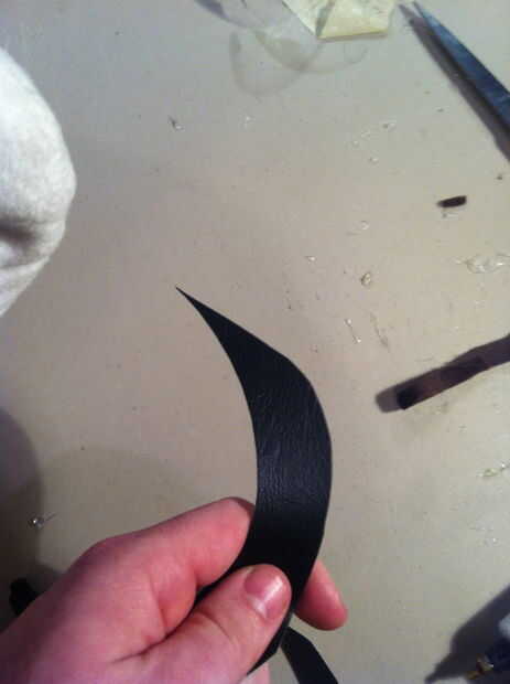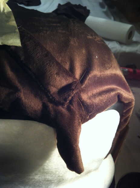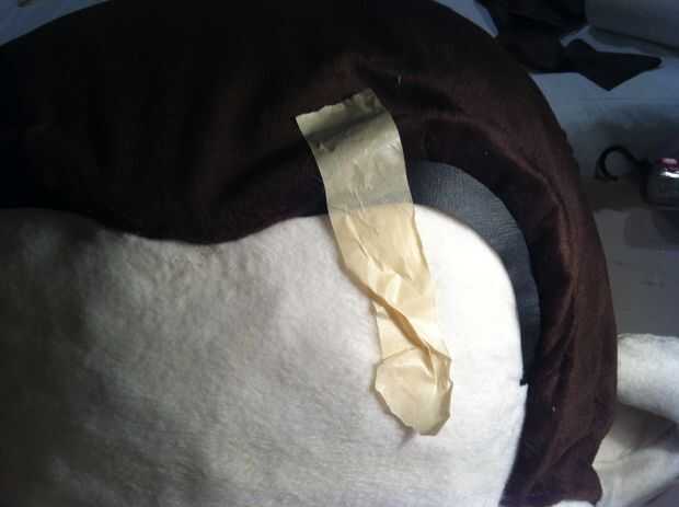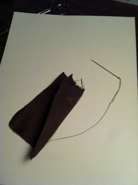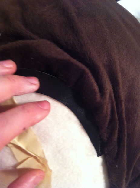 Para el cabello cortar formas de dedos largos de la piel marrón. Me corte 4 "X 5" luego había cosido 2 lados adentro hacia fuera así que podría ocultar la costura una vez resultó derecha. Con el lado abierto restante pasado tomé pedazos adicionales de la piel y rellena el dedo como el pelo para darle forma y así levanta un poco de frente de Georges. Una vez que Mecharla y coser el lado pasado. Coser el pelo en la frente (piel marrón) de George para que cuelga hacia abajo frente a la lana bronceada de su rostro un poco. Repita este paso y hacer tres piezas de pelo. Si mira mi última foto, verá una imagen mejor del pelo. El pelo también está en ángulo a un lado, no pequeña hacia abajo, así que la cosa en torcida.