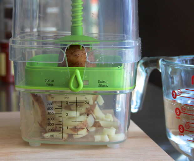 Encontré que la mejor manera de utilizar la herramienta de corte es a rebanada apagado tal vez una media pulgada de un extremo de la patata. Esto le dará una agradable superficie plana para conseguir la patata se adhieran a los dientes.