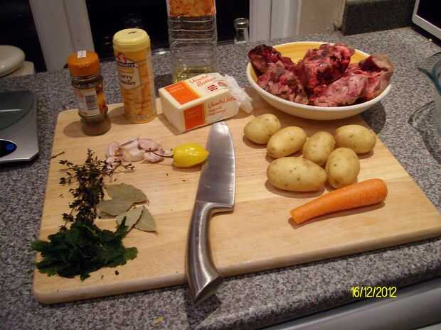 • 1kg estofado de cordero, chivo o cordero con hueso (el hueso agrega gelatina para espesar el plato y una profundidad en el sabor)