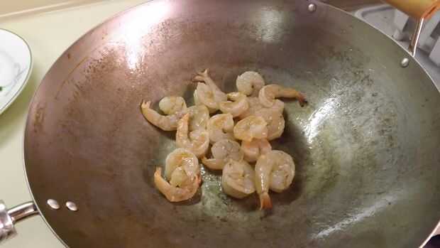 3. Añadir la otra CDA de aceite y saltear camarones durante 2 ó 3 minutos a fuego medio o hasta que comienza a girar a la rosa; retirar del wok y reservar junto con verduras