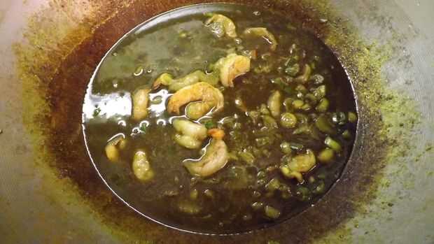 7. Aumentar el calor a medio-alto y llevar líquido a ebullición ligera otra vez; Agregue los camarones salteados y cocinar por otros 2 o 3 minutos o hasta que los camarones se cuezan (no lo cocine demasiado).