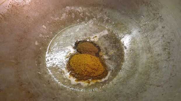 5. Cuando se derrita, agregar el Curry en polvo y comino. Bahía de vieja especia, molido Chipotle si usa y revuelva hasta que quede bien mezclado.