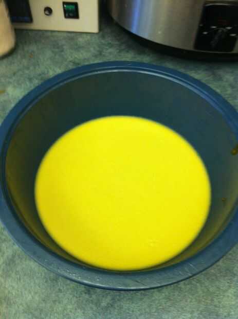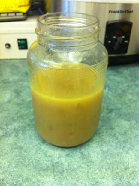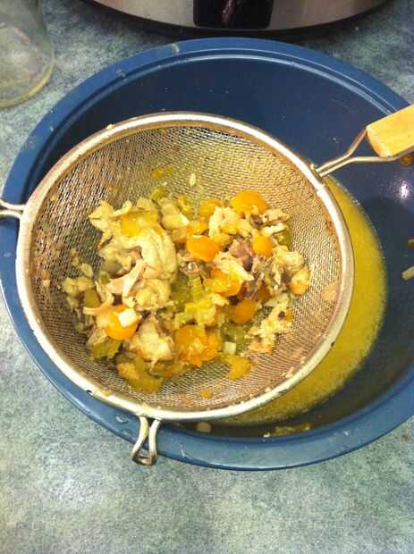 Cuando cocinar hecho colar el caldo y desechar los huesos de pollo. Colocar en la nevera y deje que se enfríe completamente. Cuando refrigerado por quitar la grasa la capa colocada en la parte superior.