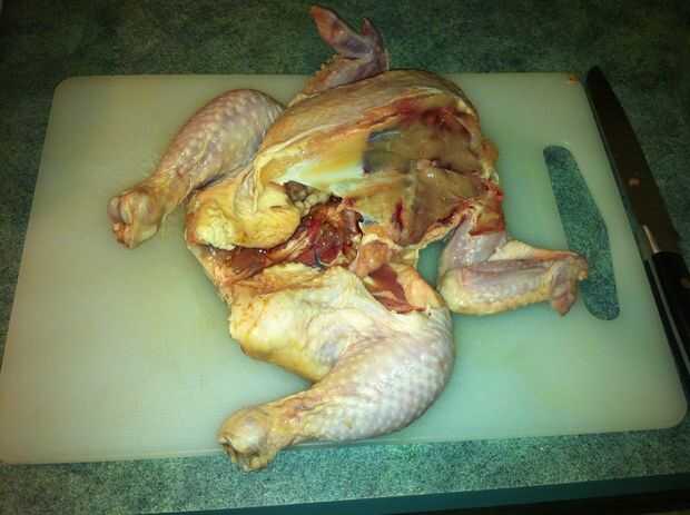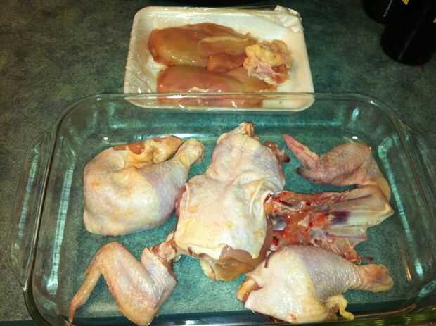 Tomar el pollo y retire la carne de pecho, cortó las alas y las patas y cortar el cuerpo por la mitad. Reservar la pechuga carne.