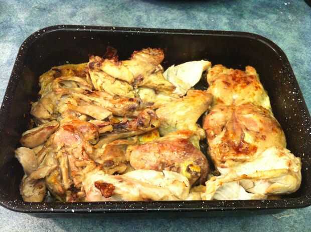 Asar en el horno a 300 grados Fahrenheit durante 1 hora el pollo los bancos cada 20 minutos.  Cuando el pollo es oro marrón quitar de encima. Desglasar la bandeja y tire la carne fuera el palo de pollo muslo y tambor.