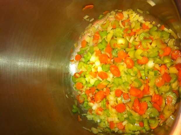 En una olla calentar el aceite. Cortar en cuadritos la cebolla, el apio y la zanahoria añadir a la olla y cocinan hasta suave, luego agregar el ajo.