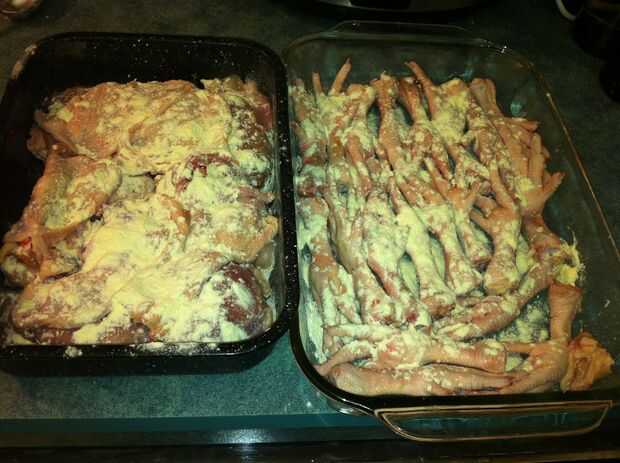 Coloque sus pies de pollo y el pollo desmontadas sola capa en una bandeja de horno o asadera. Espolvorear dos cucharadas de leche descremada en polvo sobre el pollo. Para las patas de pollo sólo agregue 1/2 taza de vino blanco a la fuente para horno la mitad lanzó cocina.