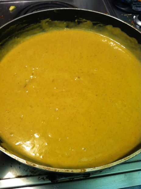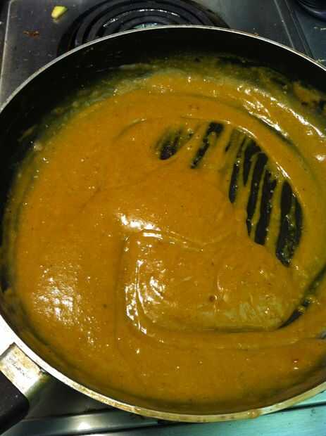 En una cacerola, añadir 1 cucharada de mantequilla y deje que se derrita una vez derretida añadir la harina creando una pasta que se llama un roux. Cocine el roux hasta llegar a un uso de color rubio claro a fuego medio bajo que se puede quemar rápidamente. Cuando el roux se cocina lentamente añadir el caldo de pollo hasta llegar a la consistencia de una crema espesa. Cuando se alcanza esto añadir tus especias a la mezcla, revolver bien. Añadir la leche de coco (o crema espesa si haciendo salsa tradicional) a la mezcla y deje a fuego lento durante unos minutos. Si encuentras que la gravey es demasiado fina todavía crear un roux en un recipiente aparte y añadir a la salsa un poco a la vez hasta llegar a la consistencia desea.