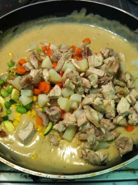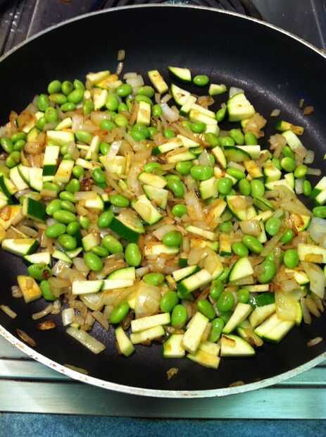 En una sartén agregar la mantequilla dorada, luego agregar la picada cebolla una vez suave agregar la cocción de ajo por 2 minutos adicionales. Añadir las zanahorias, patatas, pollo. Edamame y finalmente el calabacín. Una vez todo si cocido agregue la salsa y mezcle. Ahora tienes tu relleno para la empanada