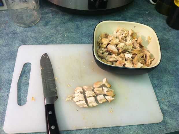 En una olla cocer la pechuga de pollo en el caldo de pollo. Una vez hecho esto cortar en cubos.