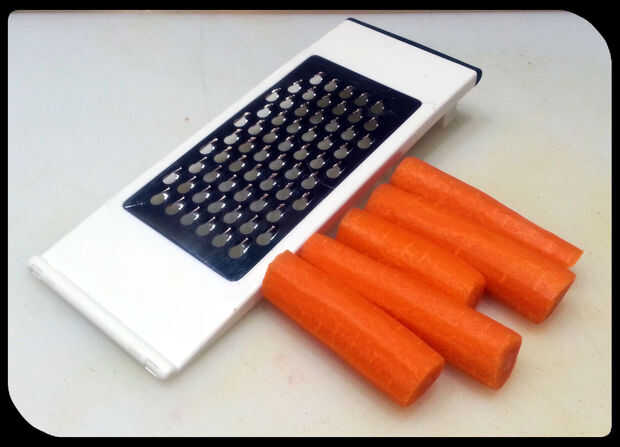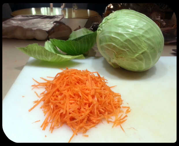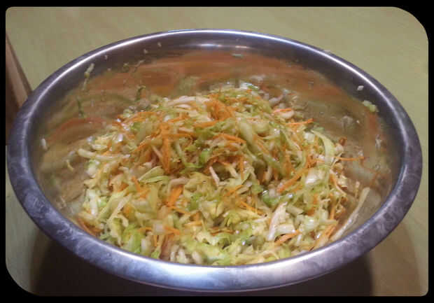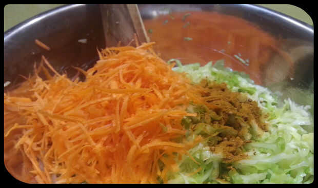 Pelar y rallar la zanahoria en los agujeros grandes de un rallador de la caja. Agregar, junto con el polvo de curry, a la col salada. Mezclar con las manos hasta que las zanahorias y curry se incorporan a la col y la sal.