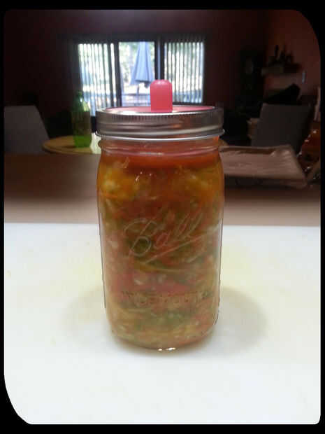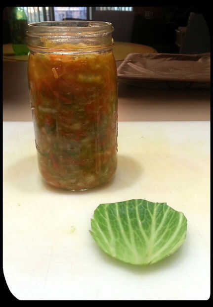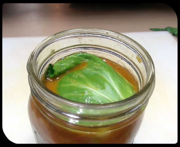 Tomar la hoja de col que de lado y establece el frasco sobre la hoja. La hoja será más flexible hacia la parte superior. Usando un cuchillo afilado, cortar un trozo circular de col del mismo tamaño que la jarra. Coloque esta hoja directamente encima el repollo para evitar que los pedazos flotando. Coloque una piedra de adobo encima de la hoja. Se debe mantener el kraut debajo de la superficie de la salmuera. Limpie el borde de la jarra. Añadir un tubo de la salmuera y el tornillo de la tapa. Situado en un lugar oscuro para fermentar. Asegúrese de etiquetar el frasco con la fecha!