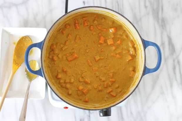 Una vez los líquidos, poner el curry a hervir y luego reducir a fuego lento. Yo normalmente a fuego lento cubierto durante 15 minutos y luego con la tapa por 15 minutos.