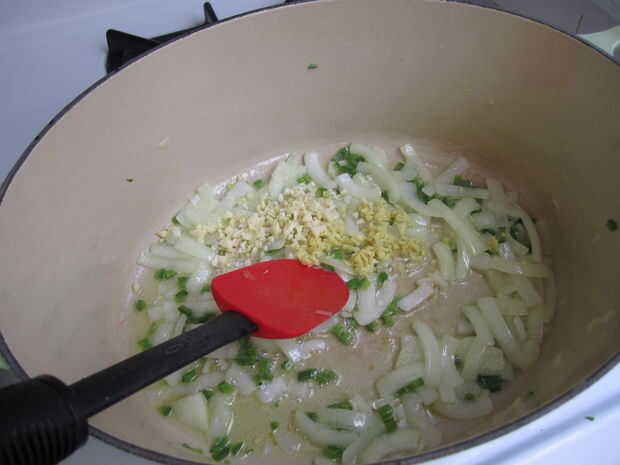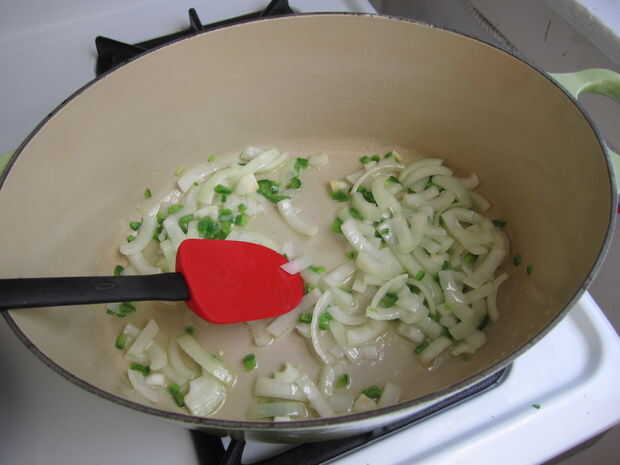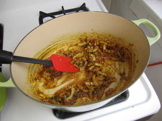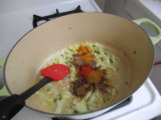 Una vez el aceite esté caliente, volcado en las cebollas y el ají y cocine hasta que ablande. Luego agregar el ajo y el jengibre y cocine hasta fragante. En este punto, añadir tus especias junto con una buena pizca de sal. Esto alrededor de revolver hasta que todo está bien cubierto.