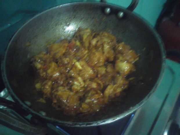 Ahora agregue el pollo marinado y cocinar durante 10 a 15 minutos para que esté bien cocido y el sabor de especias (masala), pasta y carne debe ser mezclado. Recomiendo no cubre o agregar agua durante la cocción de la carne. Cuando se cocina bien puede ver que la piel está pelando detrás sí mismo.