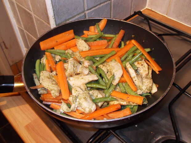 Añadir el azúcar moreno suave a la sartén. La gota en las verduras y freír el pollo durante 5 minutos a fuego medio. Esto les ayuda a disfrutar de los sabores de la pasta.