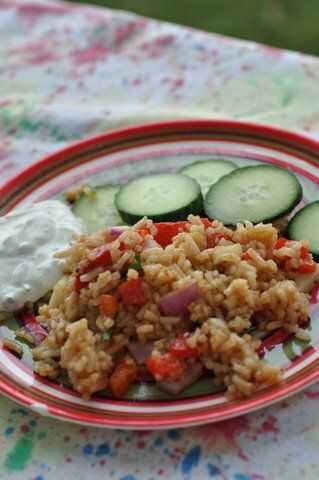 había estado visitando a mi hermana el verano pasado y ha hecho esta ensalada de arroz increíble.  Estaba tan sorprendido cuando ella me dijo los ingredientes.   Esto se ha convertido en uno de mis platos favoritos semanales para hacer.  Es tan bueno