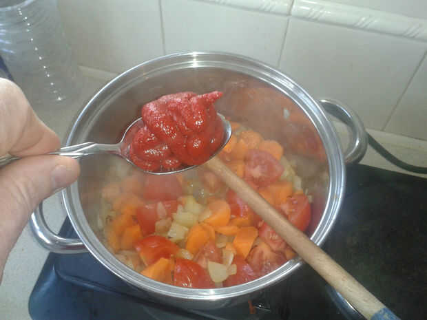 Añadir los tomates en cuartos un la chirivía pelada n cortadas en trozos pequeños y una gran cuchara colmada de puré de tomate...