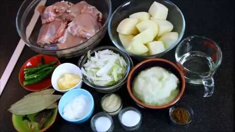 Cebolla blanca picada, pasta de cebolla blanca mediana 1 – 1 y 1/2 hojas medianas de laurel -3 canela pega-2 cardamomos -2 clavos de olor-sal y 3-4 1 y 1/4 cucharita (o al gusto) pasta de ajo – 2 y 2/1 tetera cucharas grueso yogur – de jengibre 4 té cucharas comino – 1 té cuchara de patatas – chiles de verde medio 3-4-8-9 (o preferencia) Ghee o mantequilla-3 cucharadas de té (2 cucharaditas para freír patatas) (1 cucharita de pollo) aceite