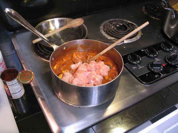 -Abrir la pasta de curry y cocinar a fuego lento con leche de coco hasta que se mezcle bien, o abrir y calentar la salsa de curry.
