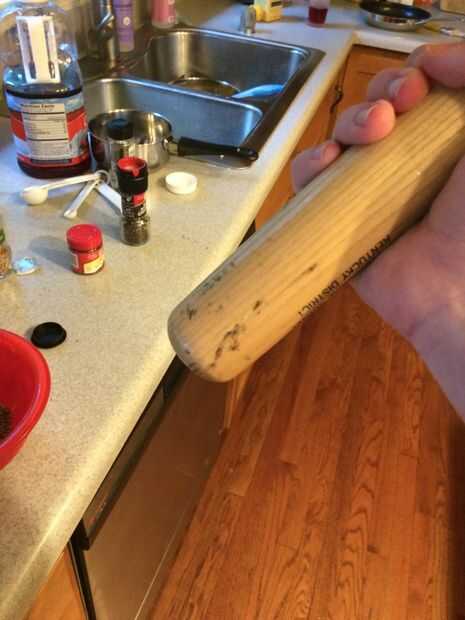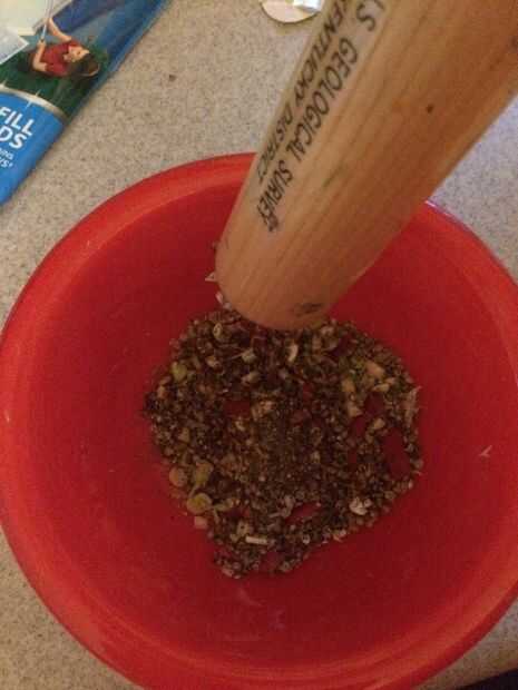 Volcar las semillas en un mortero y una maja con los granos de pimienta negras y a la rutina. Si, como yo, no tienes un mortero y una maja, ahora es tu momento de brillar! Ser creativo. Terminé usando un recipiente de vidrio y una de esas 10 pulgadas de largo los murciélagos que venden en juegos de béisbol. Mientras que esto probablemente no volar en un restaurante real, está bien por ahora.