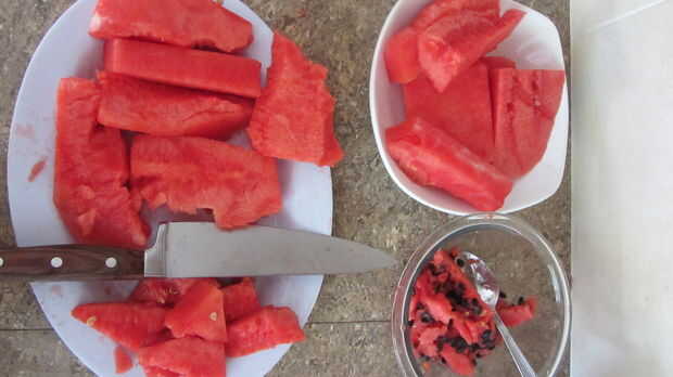 Hecho! Ahora debe tener cuatro partes diferentes de sandía, filetes, trozos que quedaron después de la siembra, pequeños pedazos que quedaron después de la siembra y las semillas y pedazos pequeños de watermlon.