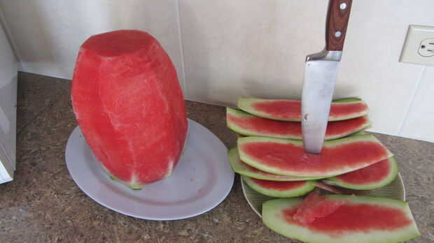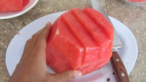Paso 5.) A continuación cortar la sandía verticalmente en secciones de 1 pulgada