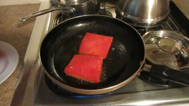 Paso 2.) Coloque sus filetes en la sartén. Ten cuidado, comienza a Arden como un loco y salpicaduras de aceite caliente para arriba!