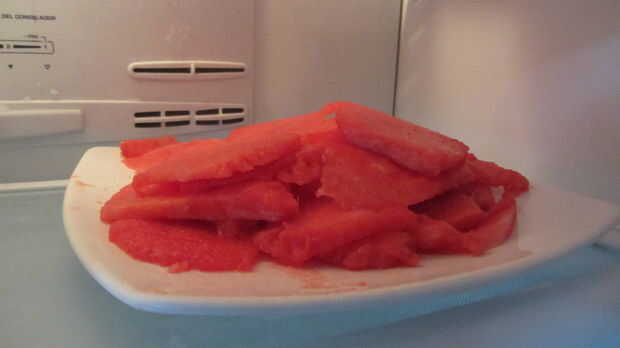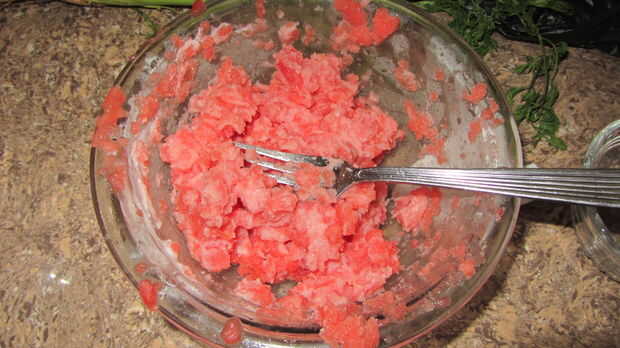 Paso 1.) Tomar alrededor de 1 3/4 tazas de sandía y congelarlas. Porque me didn´t tener una licuadora cuando hice esto y cortar mi sandía lo que sería más fácil para mí romper el hielo con la mano. It´s congelación le debe ir y hacer la ensalada y jugo.