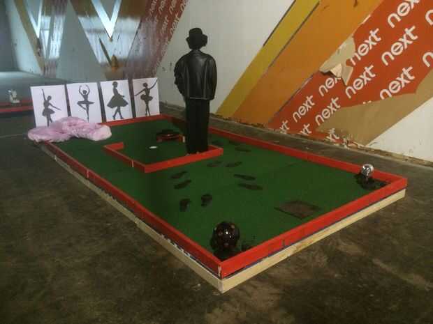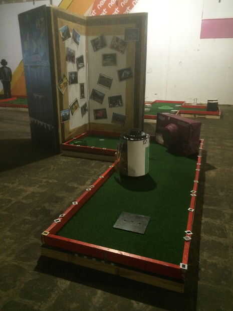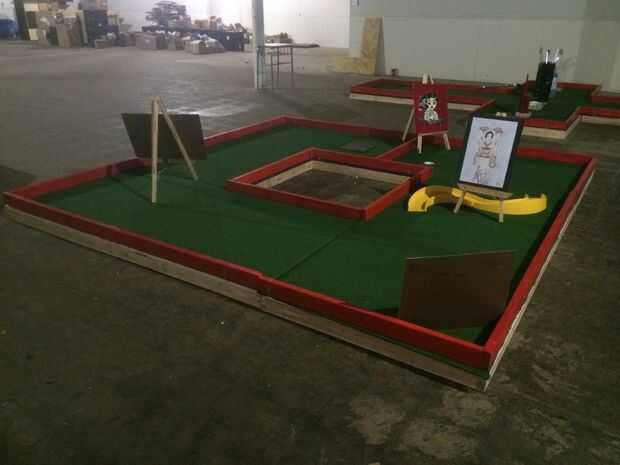La clase de geometría utiliza lo aprendido acerca de ángulos para diseñar cada agujero a agujero en oneable. El curso fue construido de una combinación de 4'x 8' y 4'x 4' plataformas encajan para formar más formas complejas. La clase de tienda construida, alfombradas, pintado y había arreglado las plataformas que forman el curso. Todos trabajaron juntos para decorar el curso - nuestro tema fue "MiniARTure campo de golf", y cada hoyo se basa en una particular forma de arte.