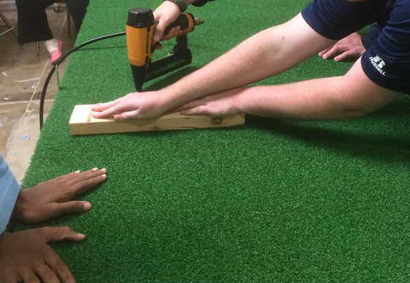 Nuestro maestro de geometría ordenó el césped. No sé dónde o cómo, pero una vez que llegaron a la tienda que estiró hacia fuera en las plataformas, grapas hacia abajo y recortar cualquier exceso con cuchillas.