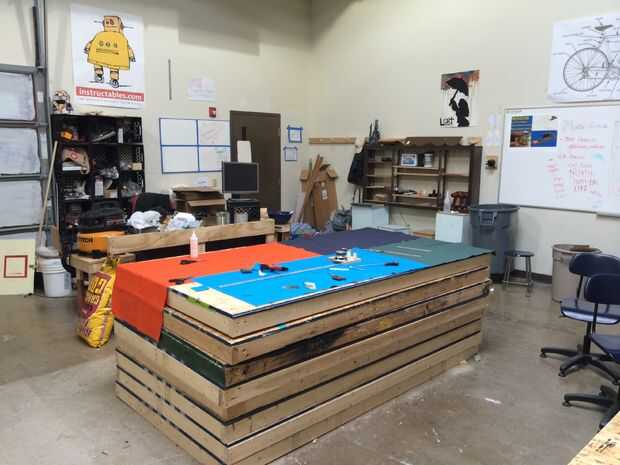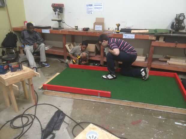 El último paso era colocar barreras según los planos de la clase de geometría. Cortamos nuestro 2 x 4 a la medida, pintado rojo, entonces utiliza tornillos y abrazaderas como estos para sujetar a las plataformas.