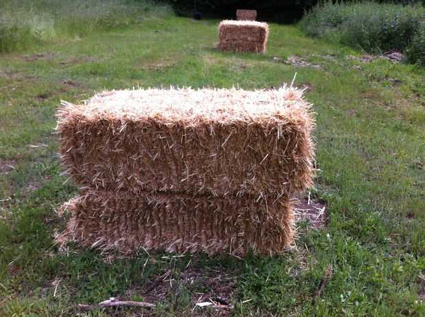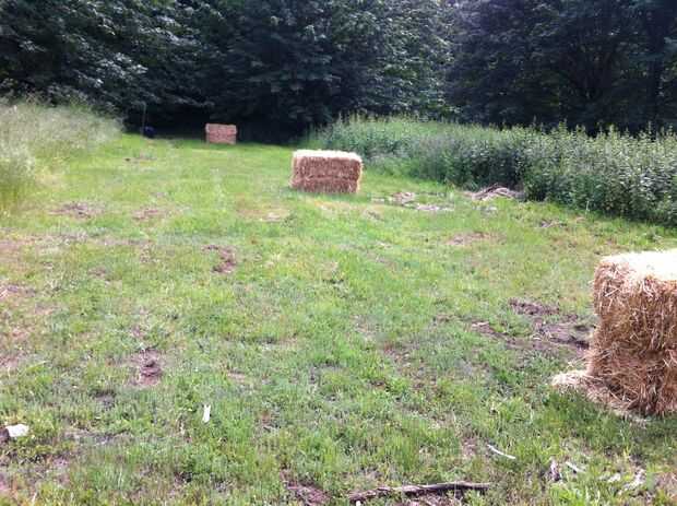 Ahora, arrastre de los fardos de heno. Para cada objetivo, necesita dos fardos de heno. Apilar las balas de heno encima de otro y establecer hasta donde usted quiere disparar. Sugiero tener seis balas de heno (tres destinos) en vez de menos. Los dos primeros deben ser 50 pies desde la línea de tiro y cerca de la derecha. Los dos segundos deben ser 100 pies hacia fuera de la línea y deben estar en el medio. Los dos terceros deberían ser 150 pies hacia fuera y más hacia la izquierda. Debe haber 25 pies de espacio detrás de los dos últimos fardos de heno.