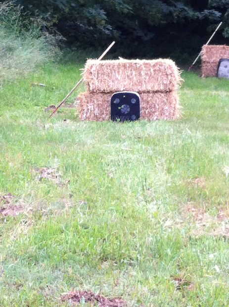 este es mi objetivo de tiro con arco casero, se hace fuera de un colchón viejo de espuma, pino tratado, alambre de pollo y una especie de cartón plástico. El objetivo es de 1m cuadrado, usar un arco de 55 libras y las flechas están paradas cerca de 5