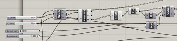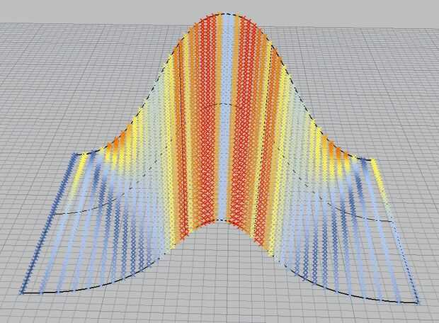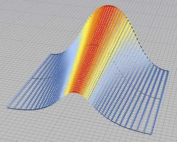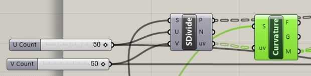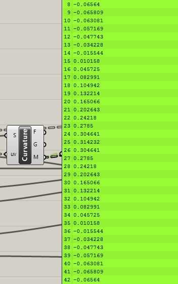 El primer paso es, por supuesto, para medir la curvatura de su superficie. Por suerte saltamontes tiene una función para hacer esto. Las entradas son una superficie y UV puntos en esa superficie. Las salidas son aviones normales a los puntos, gausiano curvatura y curvatura media en cada punto. Si nos fijamos en la salida de curvatura media, habrá un rango de números positivos y negativos. Esto es porque la curvatura es comparada con un vector, por lo general en la dirección Z positiva.