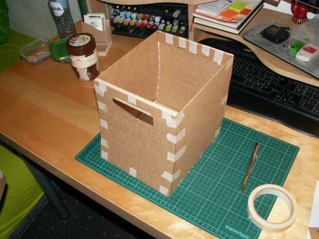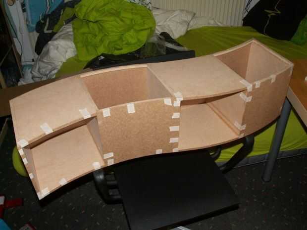 Cuando el marco está pegado y seco, puede Agregar los lados y el cajón. Es más fácil comenzar con el lado sin los agujeros, y luego pegar el otro lado. Use cinta o abrazaderas para asegurarse de que las partes permanecen en el lugar mientras el pegamento seca. Tenga cuidado con el MDF 'un cartón delgado' o triplex. Algunas cintas pueden llegar a ser difíciles tirar de sin dañar el material, use otra cinta temporal o 'cinta de pintor'.