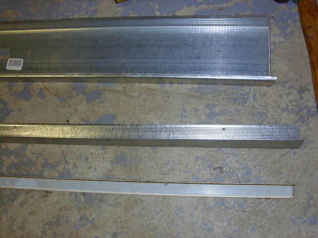 utilicé metal formado común (y barato). El flaco es un ángulo moldura que sostiene el techo a una pared es aproximadamente 3/4 de pulgada por cada lado. Es la moldura de esquina de pared seca cubriendo por encima de la pieza. Y la pieza grande es un montante de pared de metal. Todas estas piezas de metal se forma ya, así que tuve que cortar la pieza entonces martillo en cemento por lo que se convierte en una pieza de metal de hoja.